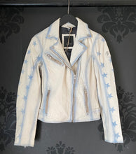 White Leather Jacket w/ Light Blue Star Details on Sleeves.